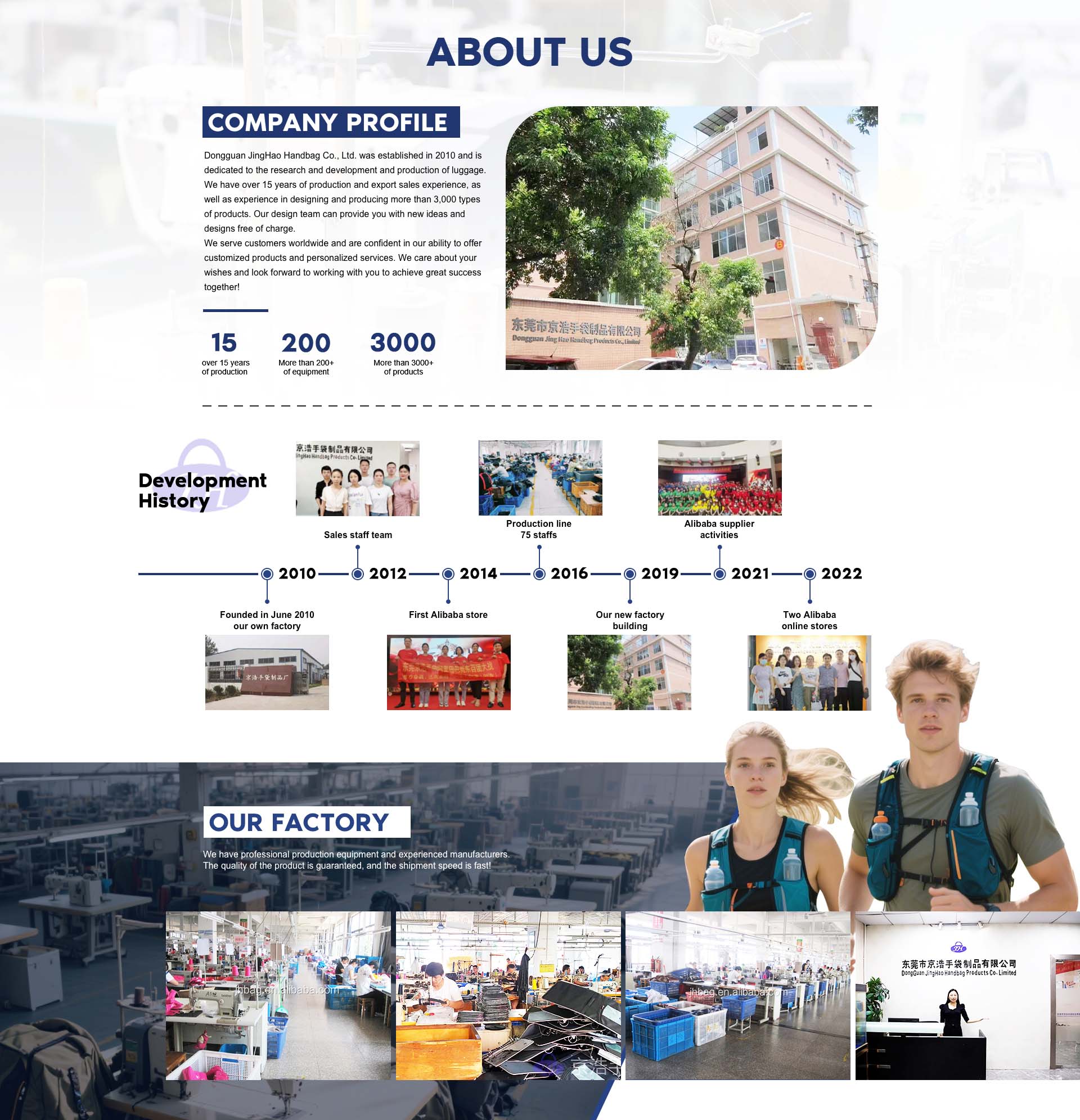 We are Dongguan Jing Hao Handbag Products Co., Limited focusing on OEM/ODM manufacturing of outdocsports bags, Function bags and fashion bags with 15 years of industry experience. We su pply a varieof sports and outdoor products to the global market with excellent quality and reasonable prices